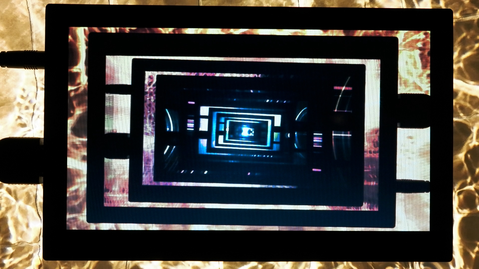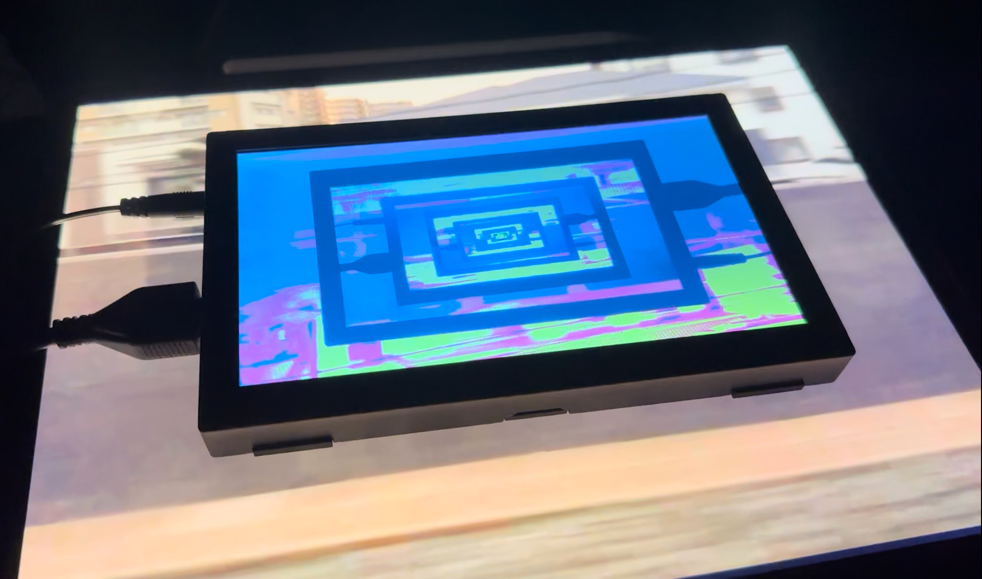 パソコンを使わずに iPad の上にモニターを物理的に重ねたものをカメラで撮影し、ドロステ効果などの現象を用いて、デジタルとアナログを融合させた有機的な VJ を行っている。